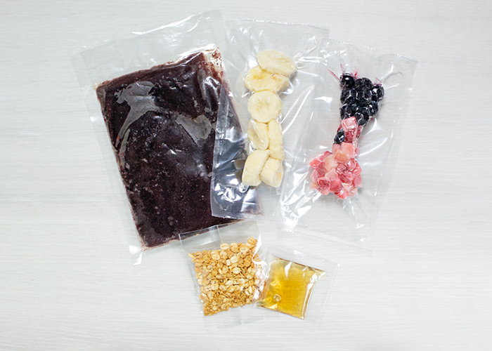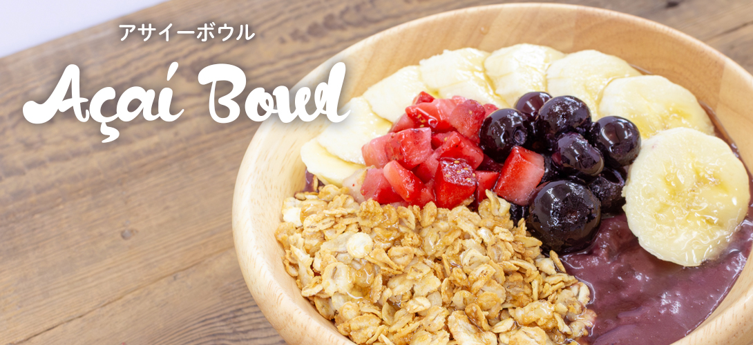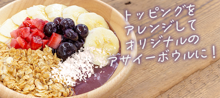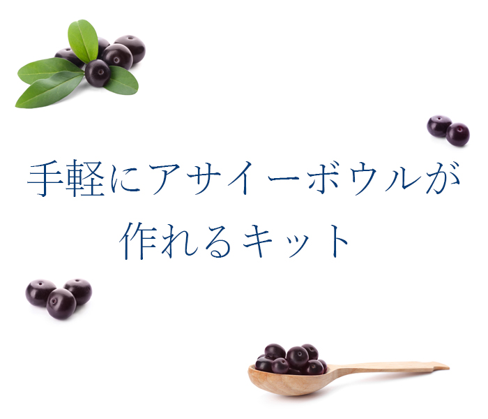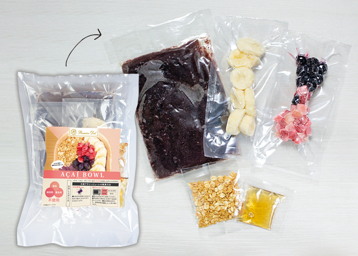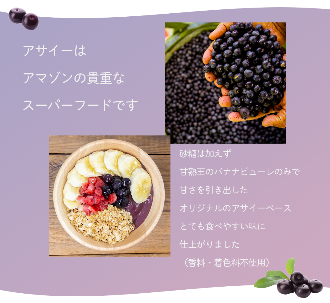 アサイーボウル セット内容 業務用アサイーキット 1袋1食分(5セット) 小売用アサイーキット 1袋1食分(5セット) 内容量 アサイーベース…150g、バナナ…50g、イチゴ&ブルーベリー…40g、グラノーラ…10g、ハニーシロップ…10g ※内容量は、業務用と小売用は同じ260gです。 ※業務用はポーションのみ(10パック)での販売も可能です。 作り方 冷凍アサイーベースのみを流水または電子レンジでお好みの固さに解凍します。 付属のバナナ・イチゴ&ブルーベリーは凍ったままでお召し上がりいただけます。 トッピングの直前まで冷凍庫で冷やしてください。 ≪解凍方法≫ ■電子レンジの場合 500W/約1分10秒 600W/約1分 袋のまま切らずに加熱してください 再加熱する場合は10秒ずつ追加加熱してください 温め時間は目安です。調理時間は機種によって多少異なります。 お持ちの容器に1を流し入れます。 付属のフルーツを冷凍庫から取り出し、ハニーシロップ、グラノーラと一緒に2へトッピングして完成。 注意事項 ・ハニーシロップ(はちみつが含まれている為)、グラノーラ(黒糖蜜が含まれている為)は1才未満の乳児には与えないでください。 ・冷凍庫から出してすぐは固くなっております。お気を付けください。 詳しくは営業担当者または下記のお問い合わせフォームよりご連絡ください。 お問い合わせ